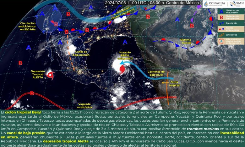 El huracán Beryl de categoría 2, se localiza en tierra al norte de Tulum, Quintana Roo, en dirección a Yucatán. Las bandas nubosas de Beryl ocasionarán lluvias intensas a puntuales torrenciales, vientos intensos, marea de tormenta y oleaje elevado en la Península de Yucatán.