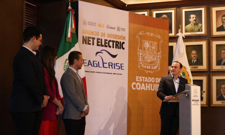 Al reiterar que la seguridad es fundamental para la llegada de más empresas al Estado, y que su crecimiento y desarrollo no es obra de la casualidad, sino producto del trabajo en equipo entre la sociedad, la Iniciativa Privada y el gobierno, Manolo Jiménez Salinas anunció la instalación de la empresa china Eaglerise NET Electric, que invertirá en Ramos Arizpe 3 mil 200 millones de pesos y generará 700 empleos directos especializados.