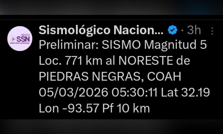 Redacción.- El Servicio Sismológico Nacional informó sobre la actividad sísmica más reciente registrada en el país, destacando un movimiento telúrico de magnitud 5 que fue detectado durante la madrugada a gran distancia de Piedras Negras, Coahuila.