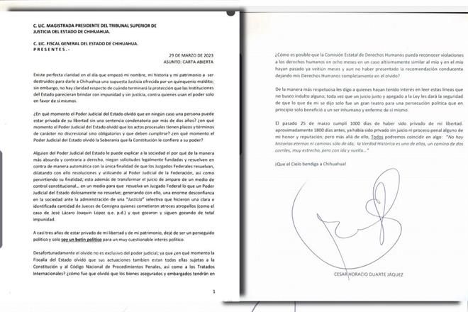«Existe perfecta claridad en el día que empezó mi nombre, mi historia y mi patrimonio a ser destruidos para darle a Chihuahua una supuesta justicia ofrecida por un quinquenio maldito; sin embargo, no hay claridad respecto de cuándo terminará la protección que las Instituciones del Estado parecieran brindar con impunidad y sin justicia, contra quienes usan el poder solo en favor de sí mismos», expuso Duarte en el documento.