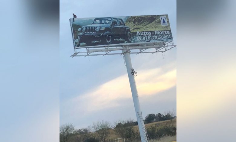 Distintos medios de la localidad dieron a conocer que el hombre, quien no ha sido identificado, trepó dicho anunció con todo y bicicleta para después sentarse a contemplar la vista.