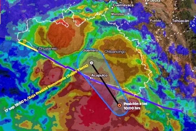 En Guerrero se pronostican vientos máximos sostenidos de 65 kilómetros por horas (km/h), rachas de hasta 85 km/h y desplazamiento hacia el noroeste del territorio a 17 km/h.
