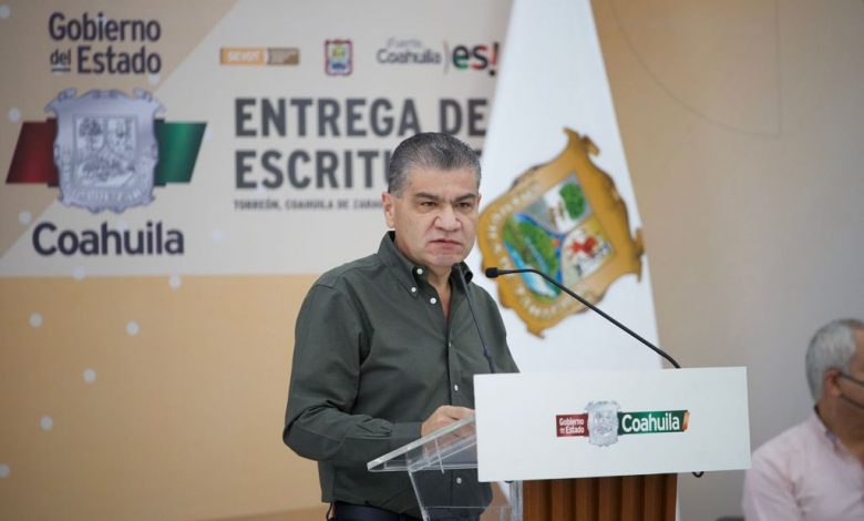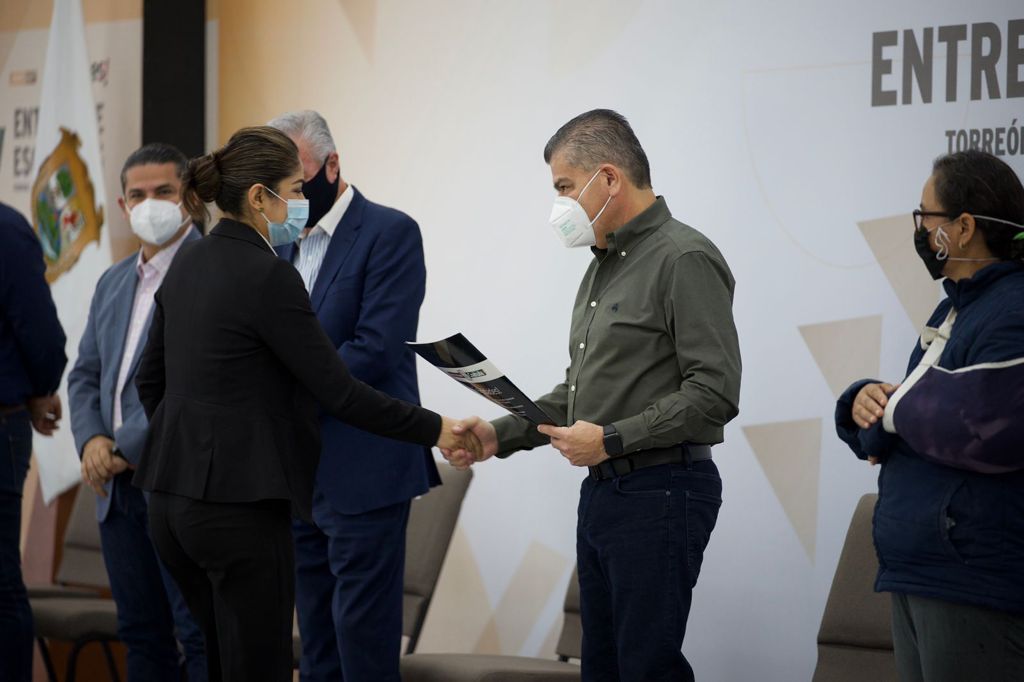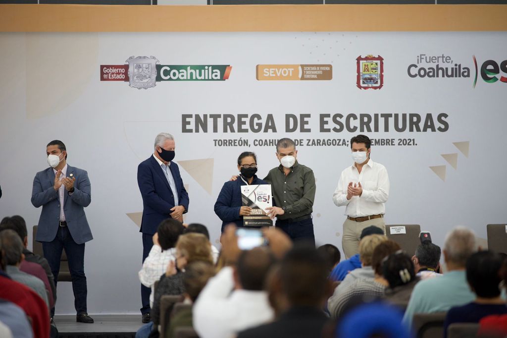 El gobernador Miguel Ángel Riquelme Solís entregó 161 escrituras en La Laguna, 80 para Torreón y el resto para San Pedro, Matamoros y Francisco I. Madero, con lo que se da certidumbre al patrimonio familiar.