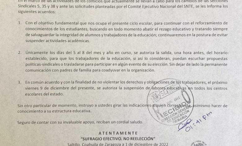 Además en el oficio se indica la autorización para que la salida de clases de lunes a jueves sea una hora antes, cuando eso no es necesario, ya que este martes termina la campaña proselitista de candidatos.