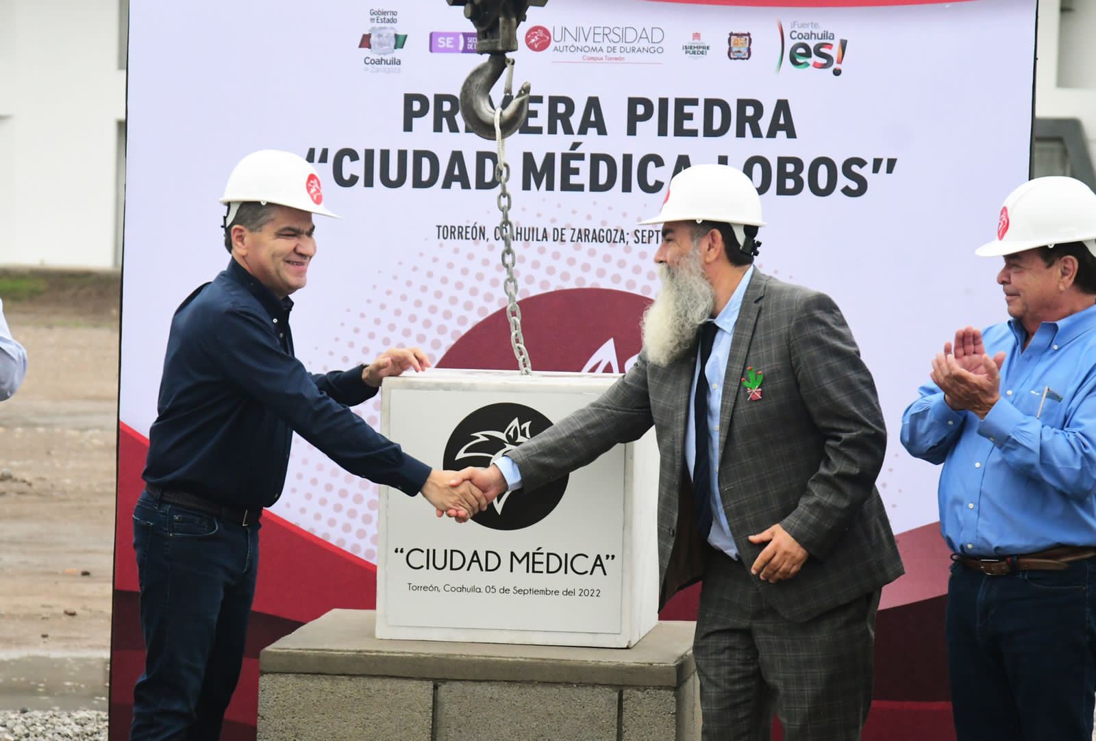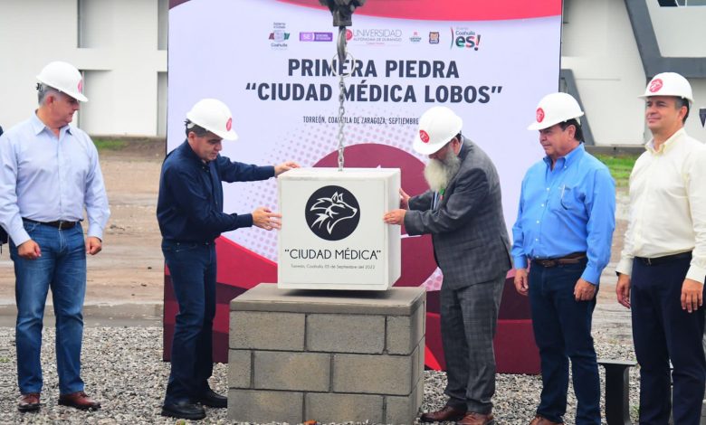 El gobernador Miguel Ángel Riquelme Solís colocó la primera piedra de la Facultad de Ciencias de la Salud “Ciudad Médica Lobos”, de la Universidad Autónoma de Durango, en esta ciudad.